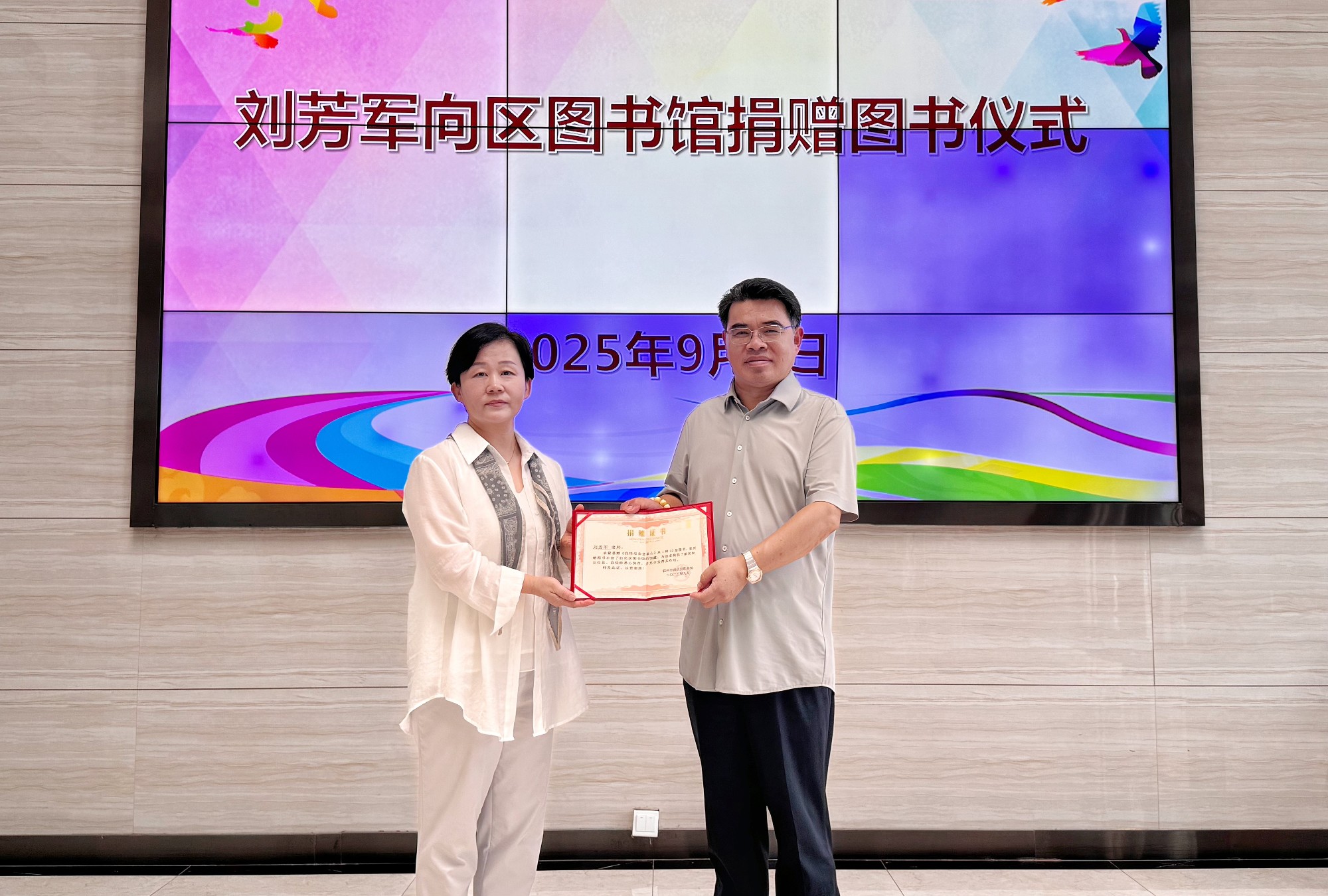 9月5日,中国散文学会会员,山东散文学会理事,山东作家协会会员,滨州作家协会会员、沾化区作协主席刘芳军先生向区图书馆捐赠个人散文集《我陪母亲登泰山》20册。沾化区图书馆馆长于振丽代表图书馆接受捐赠,并向刘芳军先生颁发捐赠证书。
